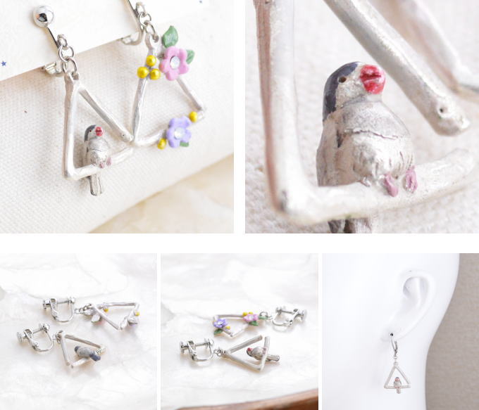 口紅みたいなビビットなくちばしがおしゃれ着用イメージはピアスを使用しておりますギフト・プレゼントのラッピング無料でお受けしますサイズ鳥約20×24mm、花27×21mm素材 ピューター カットガラス イヤリング部分 真鍮【国産・日本製・made in japan】メール便可能商品(保証なし)、宅配便・代金引換をご希望の方はご選択ください(別途送料がかかります)店頭でも販売しているためタイミングによってはご注文をキャンセルさせていただくことがありますので、ご了承くださいパルナートポックブンチョウトライアングル イヤリング ちょこんとトライアングルに乗って、他の仲間たちと音楽会♪