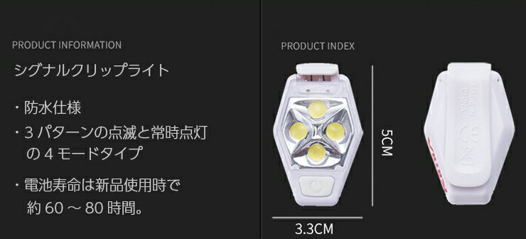 (常時点灯、点滅パターン1、点滅パターン2、点滅パターン3) ●軽さを重視した、CR2032電池ボタン2つ使用(付属) ●完全防水デザイン ●電池寿命は新品使用時で約60〜80時間。