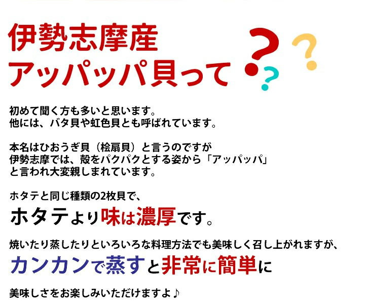 和名は「桧扇貝(ひおうぎかい)といいますが伊勢志摩では、殻をパクパクとする姿から「アッパッパ」といわれ親しまれています。